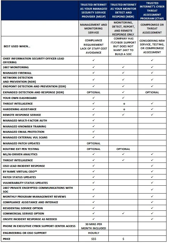 A Managed Security Service Provider (MSSP) focuses on proactively managing and securing an organization's overall security infrastructure, including firewall management, intrusion detection, and vulnerability assessments. Trusted Internet’s MSSP offering is led by a senior Virtual Chief Information Security Officer, acting as your contract CISO.